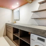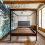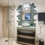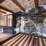 Les matériaux nobles – bois, pierre, dekton, métal – dialoguent harmonieusement avec des éléments plus graphiques comme la verrière, les textures du papier peint forêt luxuriante ou les couleurs du patio andalou. Chaque pièce a été pensée pour conjuguer esthétisme, usage quotidien et confort thermique, notamment avec la mise en valeur des murs en pierre, la pose d’un parquet chaleureux et l’optimisation des ouvertures.