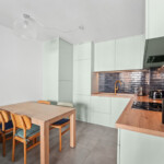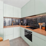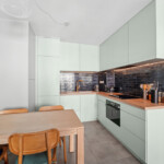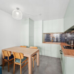 La cuisine a été entièrement réaménagée avec des façades mates aux tons doux, contrastées par une crédence en zelliges bleu nuit. Le plan de travail en bois apporte chaleur et naturel, tandis que les lignes épurées offrent un maximum de rangements dans un minimum d’espace.