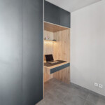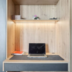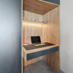 Un coin bureau discret a été intégré dans la chambre grâce à un agencement sur mesure mêlant bois clair et façades mates, pour allier sérénité, fonctionnalité et esthétique jusque dans les moindres recoins.