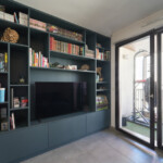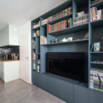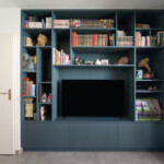 Le coin salon s’organise autour d’un meuble TV réalisé sur mesure, pensé comme une bibliothèque graphique. Chaque niche a été dessinée pour s’adapter aux objets du quotidien et aux passions des habitants, sans sacrifier la cohérence visuelle.